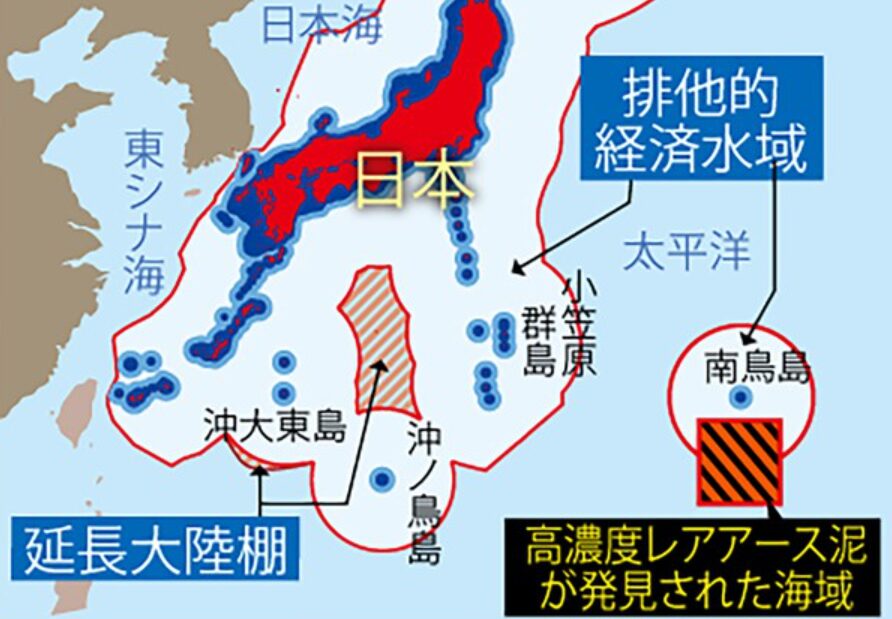 南鳥島周辺の排他的経済水域(EEZ)に、およそ1600万トン(世界3位の埋蔵量に相当)のレアアースが眠っている。