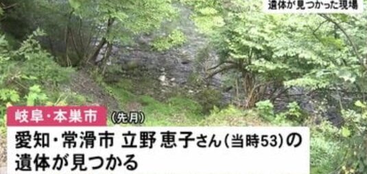愛知県常滑市に住むパート従業員の立野恵子さん53歳が岐阜県本巣市の山中で遺体となって見つかる事件が発生しました。